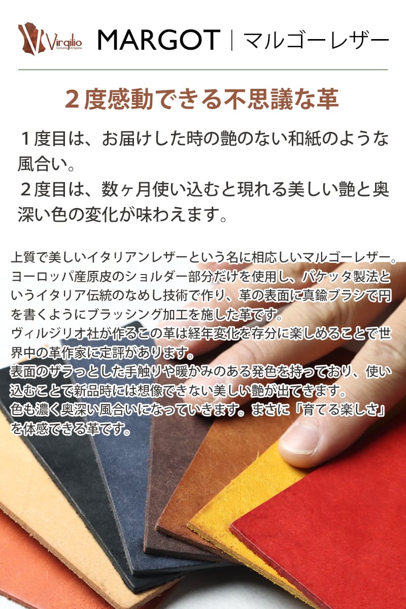 上質なイタリアンレザー、ヴィルジリオ社(Virgilio Conceria Artigiana)のマルゴーレザーで作成しており末長くお使い頂けます。